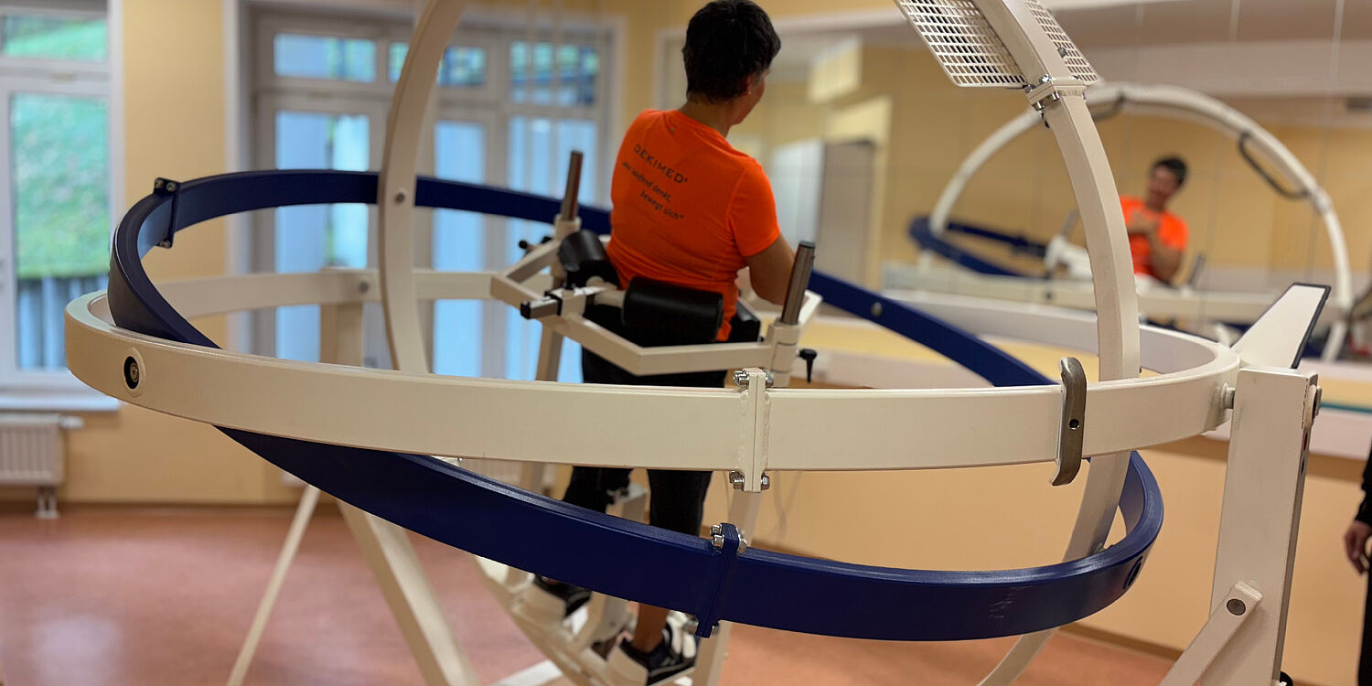 Im Spacecurl erleben Rehabilitanden der Celenus DEKIMED Bewegung auf eine besondere Weise: Durch bewusste Gewichtsverlagerung sowie eigene Kraftimpulse und Bewegungen ist eine nahezu freie Bewegung in allen drei Raumebenen möglich.