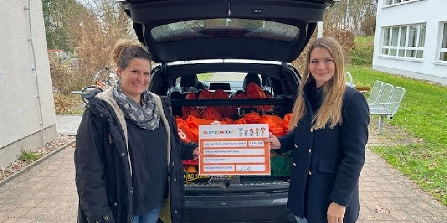 Foto: Frau Stephanie Juhnke (Bereichsleiterin IB; links) und Frau Monique Koch (stellv. Klinikdirektorin der Celenus Klinik an der Salza; rechts) bei der Übergabe der Geldspende und der Geschenkebeutel für die Kinder