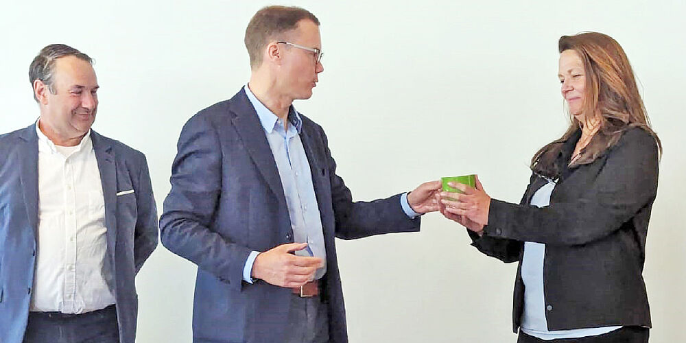 In einer kleinen Feierstunde überreichte der scheidende Pflegedienstleiter Reinald Elfert symbolisch den Staffelstab an die neue Pflegedienstleiterin…